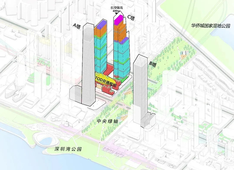 C塔被称为“未来之塔”,位于深圳市南山区深圳湾超级总部基地的“十字双轴”中心,总投资约165亿元,占地面积3.6万平方米,由高约395米和300米的两座摩天楼共同组成的一座多维度“垂直都市”,呈“双人起舞”的形体。