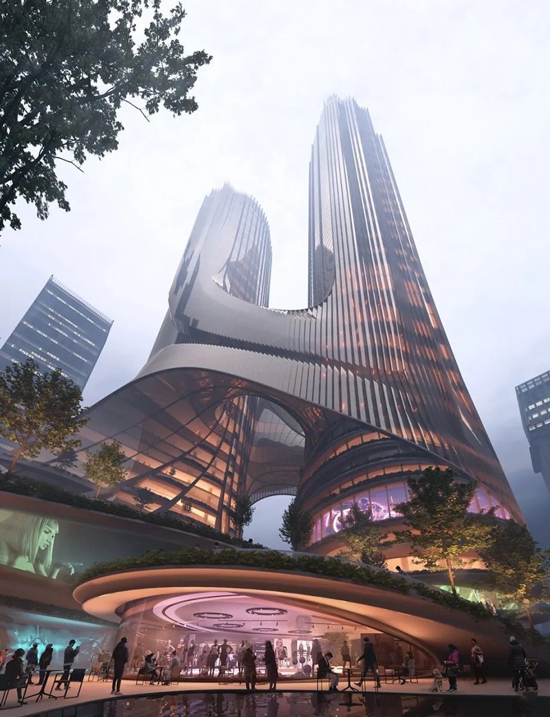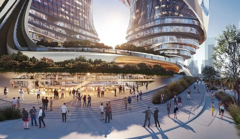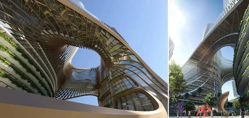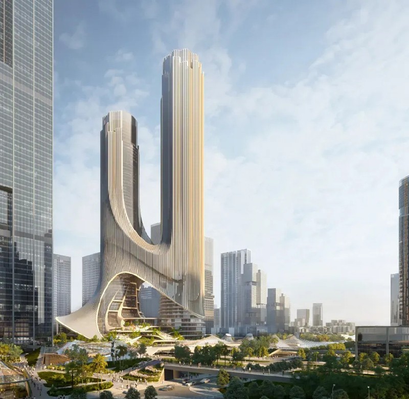 扎哈事务所的设计旨在创造一个新的地标,一组新的可识别的塔,让建筑本身成为一个公共事件。方案完美地回应了深超总城市规划设计的“十字生境”理念,并与周边的公园和广场建立了直接的联通关系——裙房梯田状的空间形态将中央绿轴自然地引入裙房公共空间,提供直接的连续感,并通过塔楼设计使该空间不断上升,使建筑整体与绿轴景观无缝连接。
