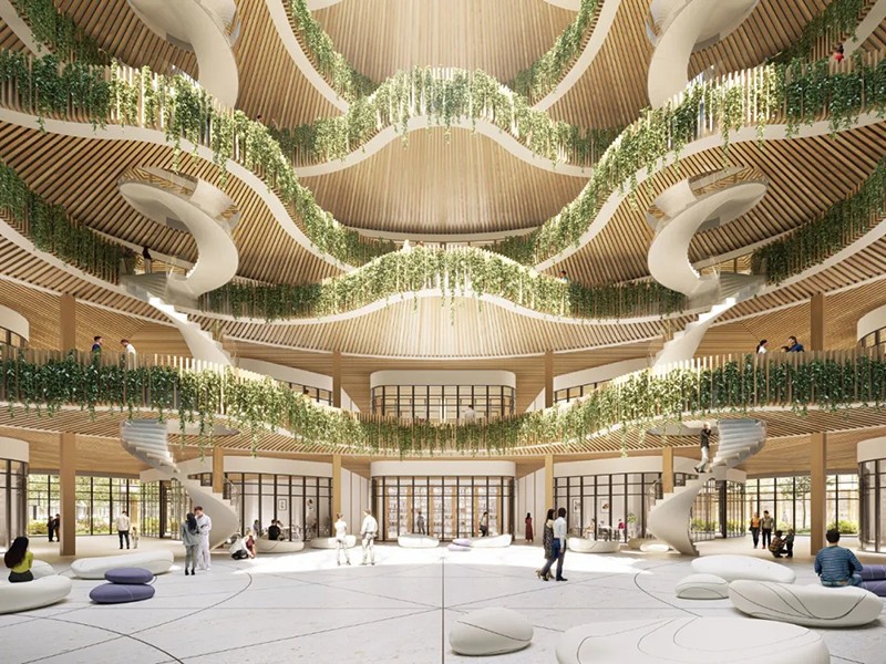 Vincent Callebaut 在比利时设计了一个生物亲环境医院园区 HOSPIWOOD,旨在提高可持续性以及病人的就医体验和康复水平。该项目将当地的医院网络集中在一个 14 公顷的园区内,旨在优先考虑可持续发展并提供高质量的医疗服务。HOSPIWOOD 是连接 Buset 和 Longtain 两地的纽带,位于东部城市大道沿线,可容纳城市景观中的各种功能,为城市的整体活力做出贡献。HOSPIWOOD 项目的核心是致力于环境责任和社区福祉。该项目的总体规划提倡高效的资源管理,将太阳能停车场、雨水收集系统和绿地等功能融入其中,以减轻对环境的影响,改善当地的生态系统。