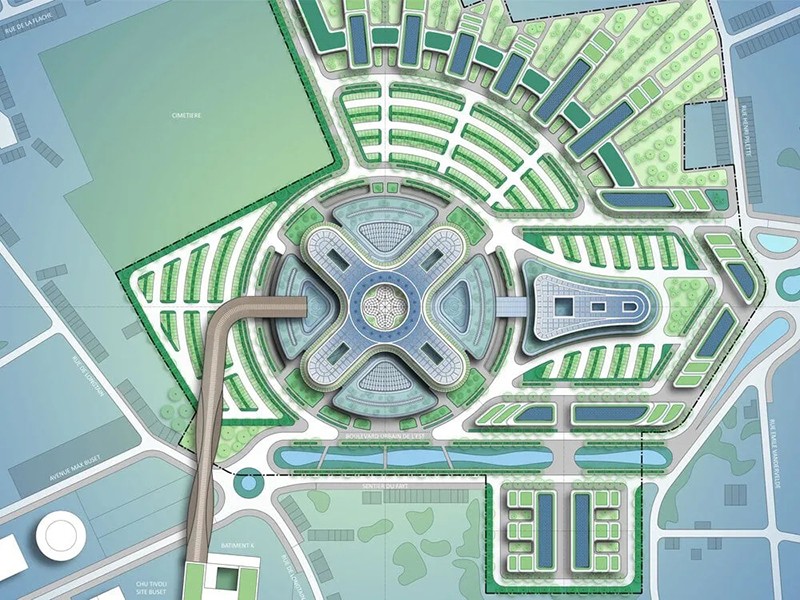 建筑师设计了一系列结构,如 K 号楼、维奇奥桥、垂直森林和医疗标志杆,这标志着传统的医院设计将转向更具综合性和环保意识的方法。K 号楼与蒂沃利医院的三足鼎立核心相连,目前正在施工中。维奇奥桥就像一座有人居住的桥梁,连接着餐厅、会议室、行政办公室等各种医务人员设施以及一个露天剧场。它横跨马克斯-布塞特大道,直接连接 K 楼和新龙潭医院,其螺旋形建筑充满活力,象征着医院的合作关系。垂直森林体现了新龙坦医院的特色,在一座中层建筑中设有 600 间客房,占地面积 66 500 平方米。其柔和的曲线营造出一种亲生物的氛围,促进健康和宁静。环形基座围绕大型天井、中庭和花园设置了技术平台。