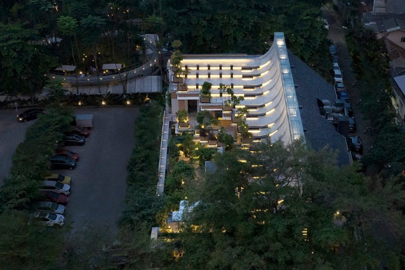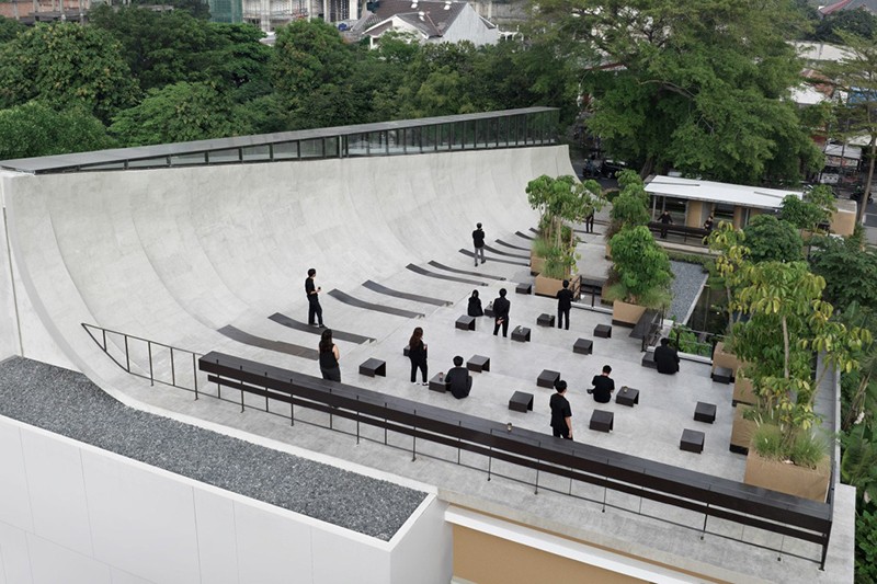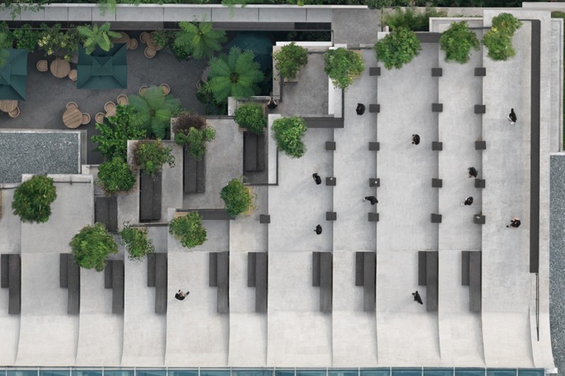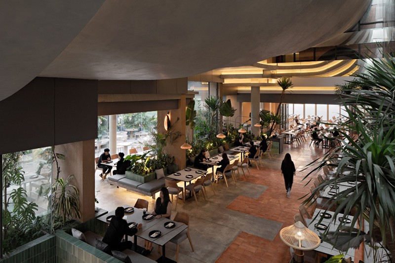 Aruma Split Garden是一个独特的餐厅项目,占地 2500㎡。其屋顶最为特别,采用了阶梯式设计,结合了屋顶、立面、墙壁、对角悬臂结构和家具等多种元素。