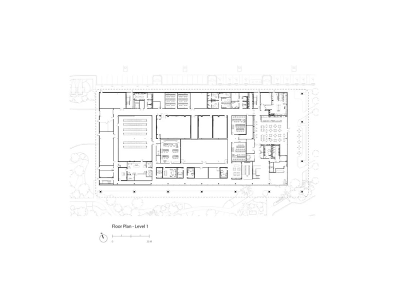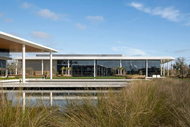 这座新建筑位于TPCSawgrass球员体育场球场南侧,紧邻 PGA巡回赛总部大楼,后者也是由 Foster +Partners 设计。建筑采用与总部一致的设计语言,南、东立面设有宽敞的柱廊,大型悬挑屋顶提供遮荫,同时,玻璃幕墙确保了充足的自然采光,并可眺望水景及周边园区。园区内设有景观步道连接两座建筑,方便员工与访客通行。建筑材料选用白色金属、混凝土与玻璃,以保持整体风格的协调统一。