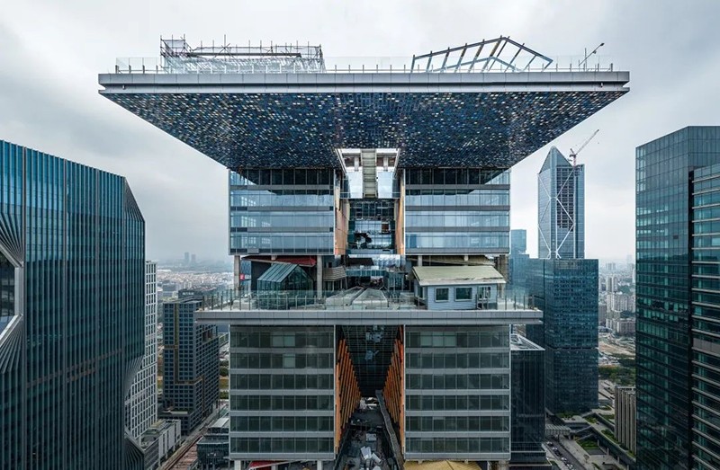 其标志性设计包括4道单边悬挑景观平台,形似“火箭发射台”,创下国内超高层直挑结构首例。