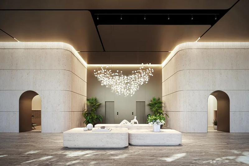 居民将享受超过7432平方米的专属设施空间,分布在大楼的顶部三层。66层的健康俱乐部设有929平方米的水疗和健身区域,包括Technogym设备、重量训练室、HIIT区域、瑜伽室、冥想室和美容套房。 67层的业主俱乐部提供双层高的葡萄酒和烈酒休息室、私人餐厅、办公套房和会议室。 70层的屋顶观景台设有成人专属泳池、双层高中庭休息室和天空酒吧,居民可在850英尺的高空享受壮丽景色。