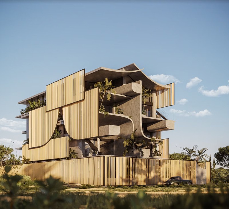 屋顶呈波浪状起伏,这不仅为建筑增添了独特的建筑特色,还反映了自然形态,其灵感源自海浪和连绵起伏的地貌。对天然材料的重视、绿植的融入以及有机的形态,都体现了亲生物的设计理念。这种设计哲学旨在让居住者更紧密地与自然相连,促进身心健康和可持续发展。木质板条的使用以及开放、通风的设计,显示出受到了热带建筑风格的影响,热带建筑常常会融入一些元素来散热和增强通风效果。