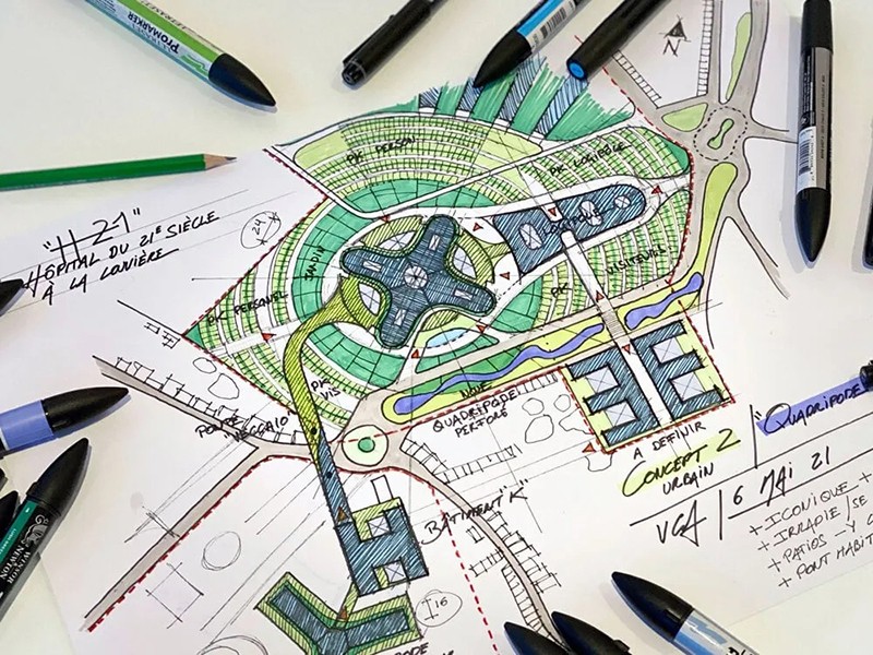 HOSPIWOOD 的目标是打造一个真正的生态社区,让居民在这里享受生活、工作和就医的乐趣。该项目注重资源和流量的高效、平衡管理,在保护环境的同时最大限度地利用场地资产。该项目融合了生态和团结过渡的元素,如城市绿化、可再生能源利用和可持续交通。总体规划采用放射状同心布局,将人流引向中央中庭,将其作为城市公共枢纽。建筑与景观和谐地融为一体,融入了风力涡轮机和重新利用的矿渣等特色元素。保护景观包括将龙潭地块改造成郁郁葱葱的城市森林,以防止土壤人工化。这包括种植当地特有的树木,促进本地生物多样性,以及实施雨水收集系统。新东部城市大道沿线绿树成荫的山谷是一个显著特点,它是一个雨水过滤池,为居民提供了一个宁静的环境。这种综合方法尊重了该地区的工业、文化和自然遗产,丰富了社区的特征。