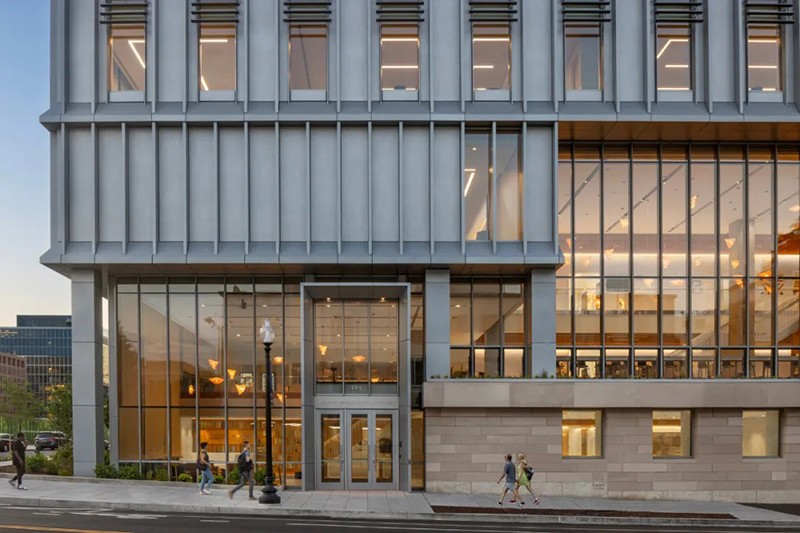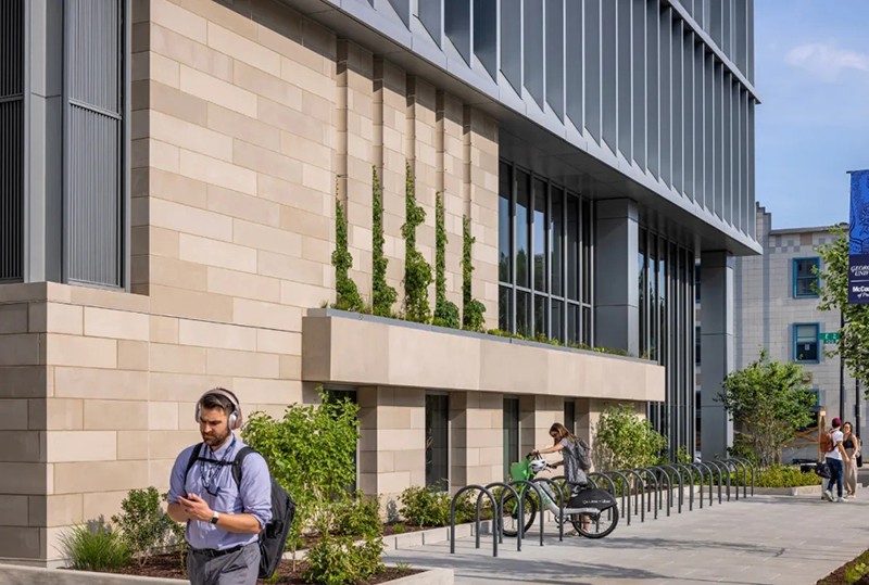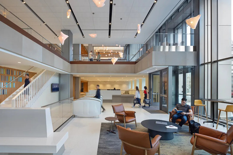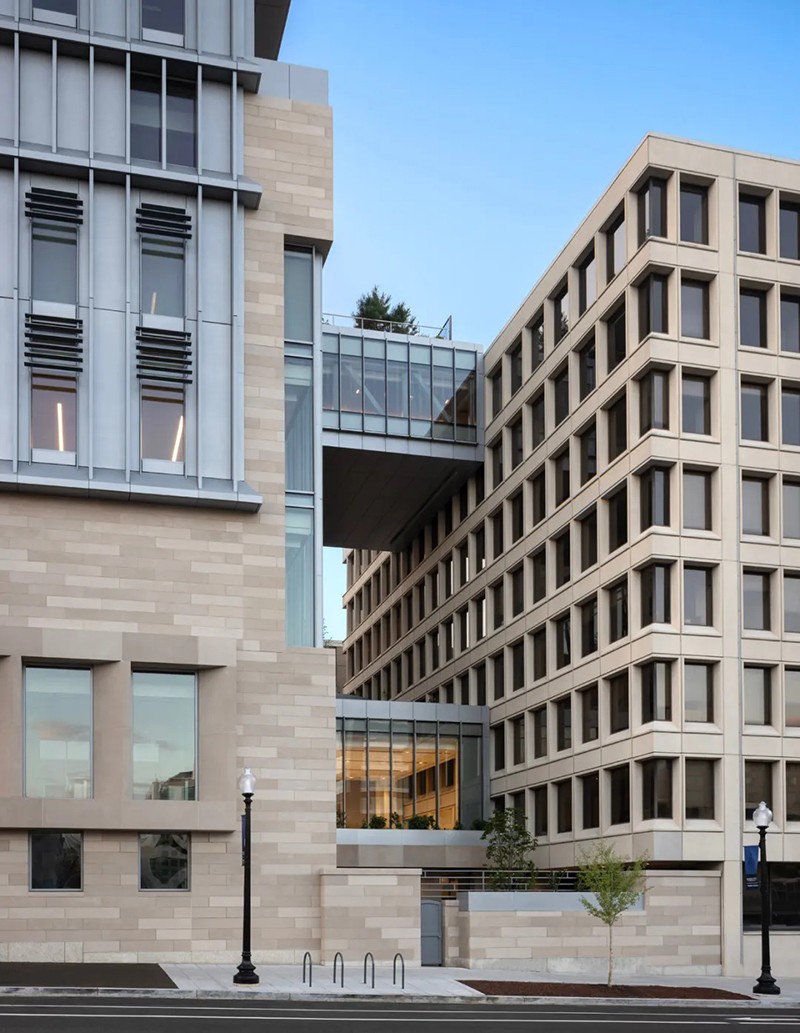罗伯特-A-M-斯特恩建筑设计事务所(RAMSA)为位于华盛顿市中心乔治敦大学国会大厦校区的麦考特公共政策学院设计了一座新的旗舰建筑。这座新建筑占地 150,000 平方英尺,位于西北部 125 E 街,是学生、教师、研究人员以及活跃在美国首都的广大决策社区的学术中心。大楼内有大量的教育和社区空间,包括 20 间教室、一个宽敞的主公共空间、学术办公室、一个可容纳 400 人的礼堂,以及一个可俯瞰美国国会大厦全景的大型屋顶露台和一个可容纳 280 人的会场。作为一个致力于应对复杂的国家和国际挑战的学术中心,麦考特公共政策学院将可持续发展和能源效率放在首位,其设计目标是获得 LEED 白金级认证。此外,由建筑师、设计师、艺术家和雕塑家玛雅-林(Maya Lin)设计的一系列针对特定场所的原创装置,鼓励建筑使用者考虑周围的自然环境。作为国会大厦校区的旗舰建筑,麦考特学校是乔治城市中心文脉和连贯性的延伸。125 E St.是一座由石材、镶板金属和玻璃幕墙组成的立方体建筑,其外形和规模与周边建筑一脉相承。垂直鳍片和砖砌底板--主要用于遮挡阳光并优化热性能--用凸出的线条勾勒出建筑的立面,与邻近的西北第一街 500 号的统一冲孔窗户遥相呼应。然而,麦考特学院的 125 E St. 建筑则通过金属、石材和玻璃的交错使用,引入了新的视觉趣味。麦考特公共政策学院的内部建筑是由其独特的地理位置所提供的教育机会所决定的,即靠近美国国会大厦和最高法院等国家主要决策机构。可容纳 400 人的礼堂具有广播功能,屋顶场地可容纳 280 人,可接待主要的政策制定者和从业人员,进行与国家和国际政策制定相关的重要讨论。大楼的设计提倡有机互动和偶遇,以促进形成一个强大、互联和包容的学术社区。玛雅-林工作室(Maya Lin Studio)的一系列装置作品名为 “映射我们在世界上的位置”(Mapping Our Place in the World),为室内空间增添了活力,使居住者置身其中,促使他们思考自己与更广阔世界的联系。“波托马克河沿岸 "是一个安装在天花板上的玻璃大理石作品,仿佛鸟瞰波托马克河流域。在主公共区,一系列名为 “是否有鸟 ”的天气响应吊灯会根据阳光、云朵、雪或雨的存在而改变颜色。当地水道、湿地、森林和草地在一天和一年中不同时间的录音,通过主楼梯上方的定向扬声器播放。林还参与了建筑屋顶景观的设计。“空中花园 "是一个带有椭圆形水池和本地植物的室外露台。它为人们提供了安静交谈和休憩的机会,同时还弘扬了地区生态,并将美国国会大厦的美景尽收眼底。