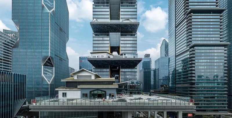 其标志性设计包括4道单边悬挑景观平台,形似“火箭发射台”,创下国内超高层直挑结构首例。