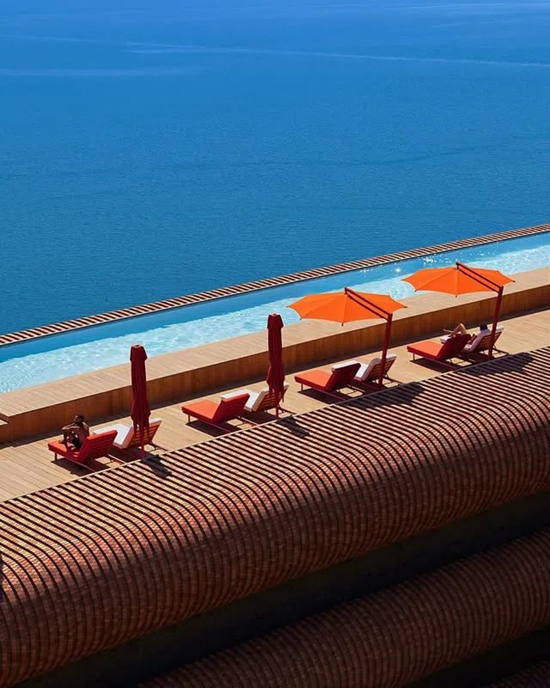 在悬崖之畔,建筑与自然相拥。盘旋的车道似丝带缠绕山间,错落的建筑如精巧积木嵌入绿意。车辆静卧其中,行人悠然漫步,山海为幕,奏响一曲人类巧思与自然壮丽的和谐乐章。
